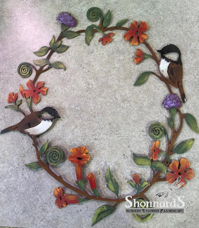 Rustic Painted Metal Wreath Chickadees & Flowers 13"