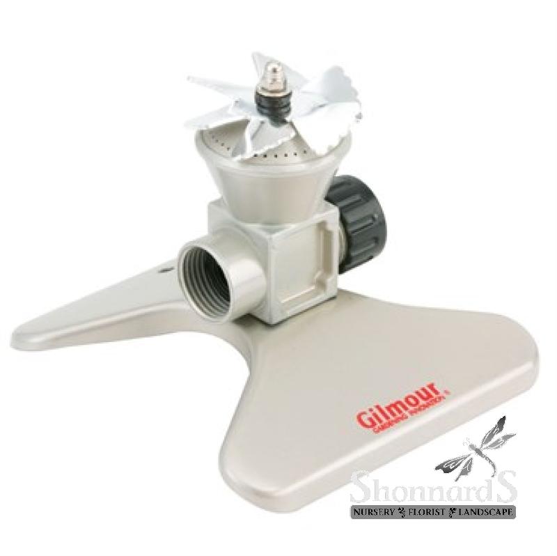 Gilmour's Metal Vane Sprinkler is ideal for watering medium sized areas with a faster flow. Every vane sprinkler is 100% water tested to ensure leakproof performance. It features rustproof metal construction, 6 sturdy fins to direct water spray and a light-weight compact design.