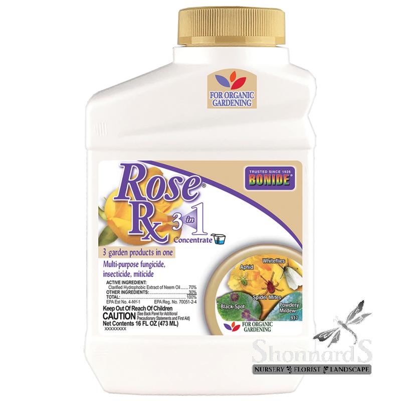 BONIDE Rose Rx® (3-in-1), insecticide, fungicide, miticide for organic gardening. Controls plant disease, mites and all stages of insect life cycles. Use on roses, flowers and more.