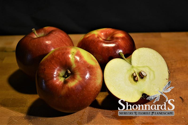 A popular red table apple with a greenish blush, excellent flavor, keeps well, late harvest; eating apples are high maintenance and need a second pollinator; the perfect combination of accent and fruit tree, needs well-drained soil and full sun.