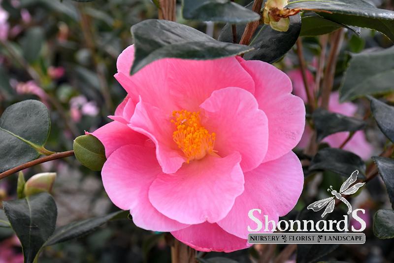 Lustrous evergreen foliage cover this upright shrub; masses of large, shell pink semi-double flowers bloom in late winter; provide rich, acidic, moist, well-drained soil.