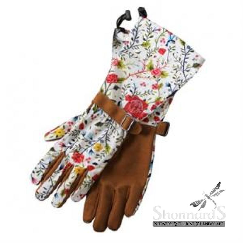 Womanswork® Glove with Arm Saver is a beautiful cotton twill print is used for this garden glove with nearly elbow length arm saver cuff. Palms are made with sturdy synthetic leather. A stretchy pull cord at the top of cuff.