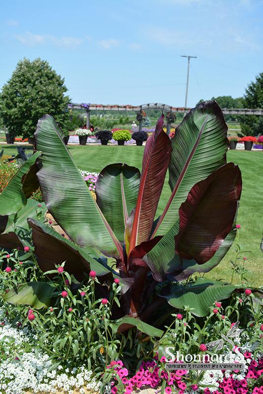 A popular choice for creating tropical effects; grown primarily for its stunning green and burgundy-red variegated foliage and stems, this variety makes a beautiful statement in the garden or containers; may be wintered indoors in colder areas.