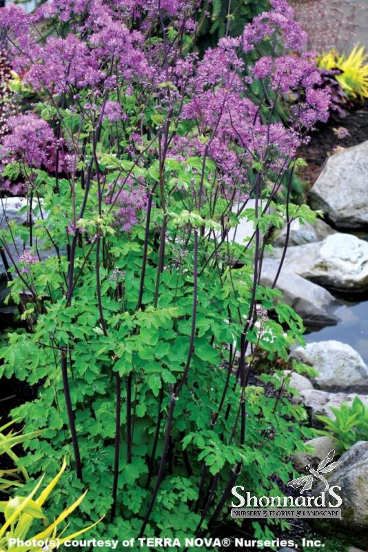 Known for its tall, slender black stems, this meadow rue showcases delicate clusters of purple flowers that sway gracefully in the breeze. Its foliage is equally noteworthy, featuring finely divided, fern-like leaves that provide a lush backdrop for the flowers.