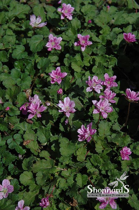 This pretty dwarf variety forms a low clump of tiny lobed and filigreed foliage; double pink flowers have deep violet stripes, and appear from late spring until fall; wonderful for border edging, grouncover for small areas, or containers