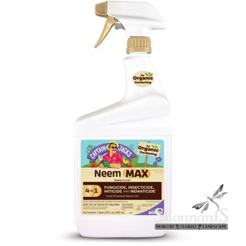 Bonide® Captain Jack's™ Neem Max RTU is an all-purpose three-in-one fungicide, miticide, and insecticide for organic gardening that is derived from the Neem seed. Safe to use on roses, flowers, vegetables, fruits, herbs, indoor houseplants, trees, turf, shrubs, and any other organic gardening you may perform. Active ingredient: Cold Pressed Neem Oil 70%