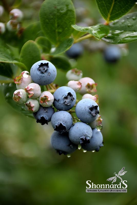 A common variety loved for its sweetly-flavored light blue fruit in summer and pretty bell-shaped flowers, bushy and often arching, a heavy and early producer; blueberries need highly acidic soil, perfect drainage and mulch.