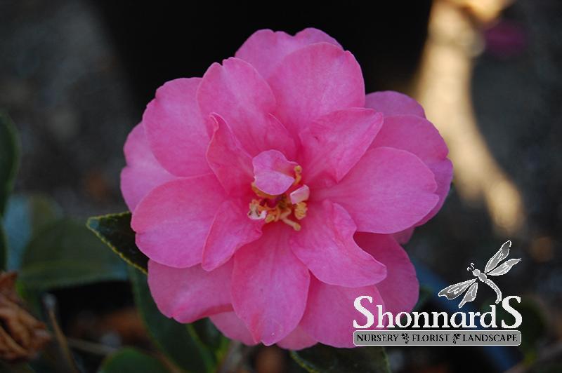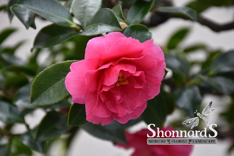 Shishigashira Camellia features showy rose round flowers with yellow eyes at the ends of the branches from mid fall to late winter. It has dark green evergreen foliage. The small glossy pointy leaves remain dark green throughout the winter.