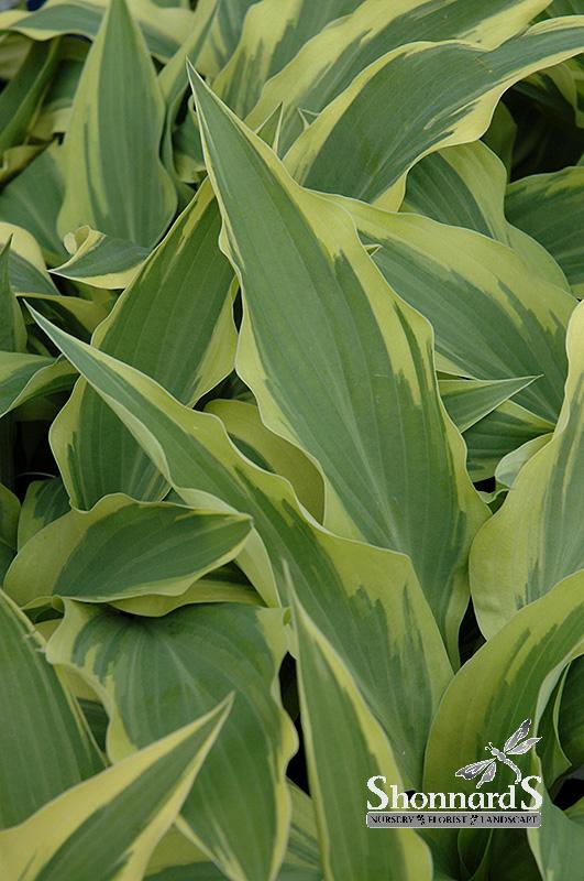 The HOSTA 'Lakeside Dragonfly' is a stunning perennial known for its variegated foliage. This variety features a unique leaf shape that resembles a dragonfly's wings, showcasing a beautiful blend of green and gold tones. The leaves have a smooth texture, making them a delightful addition to any garden or landscape.