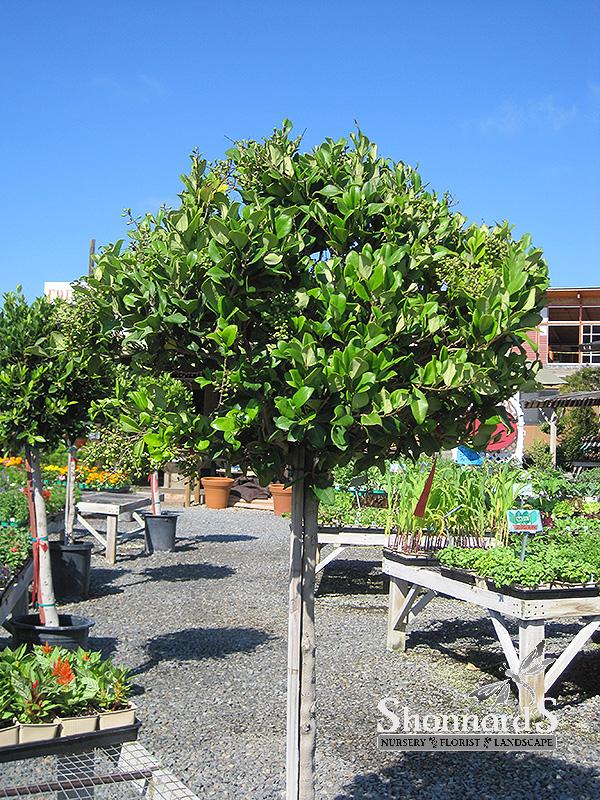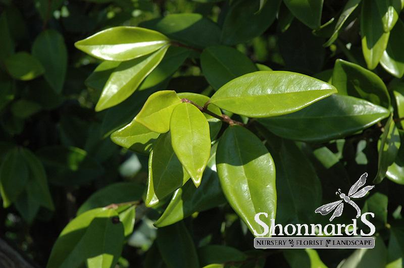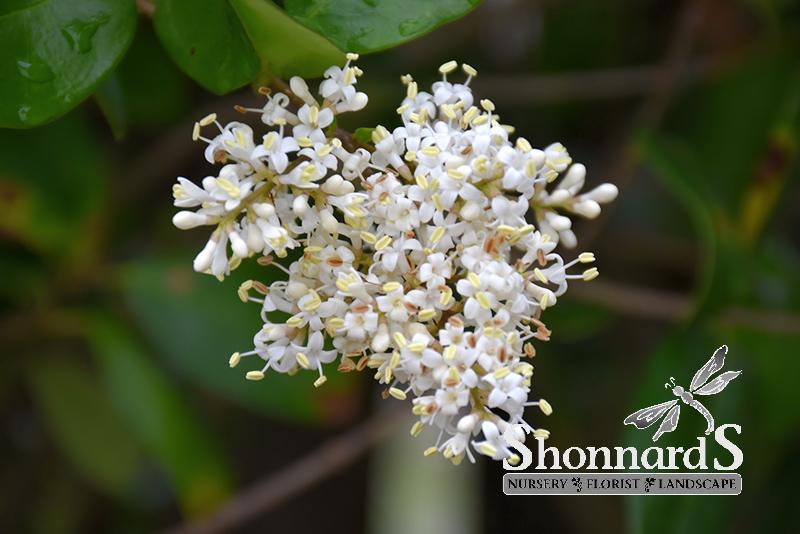 This fast grower is covered with attractive waxy oval leaves; the shrub has a more open shape as it ages, it is quite beautiful and can be limbed up and used for bonsai; shows drought tolerance; delightful panicles of white flowers; makes a great hedge