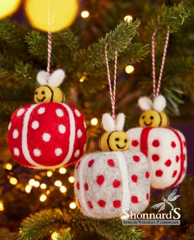 Transform your Christmas décor with our unique and captivating felt bee and gift hanging decoration, in 3 color combinations of grey, red and white. Each polka dot ribboned present has a happy, busy bee with open wings and a candy stripe thread. Embrace the unconventional with our eco friendly, sustainable decorations and unleash your creativity by pairing this piece with other enchanting needle felt designs for a truly magical Christmas display! Hand crafted in the serene foothills of the Himalayas by a talented female workforce, each decoration is made from sheep wool and colored using safe, tested Azo-free dyes only.