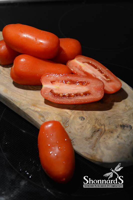 San Marzano Tomato is an annual vegetable plant that is typically grown for its edible qualities. It produces red long tomatoes (which are technically 'berries') with red flesh which are usually ready for picking from mid summer to early fall. This is an indeterminate variety, which means it produces fruit throughout the growing season. The tomatoes have a pleasant taste and a firm texture.