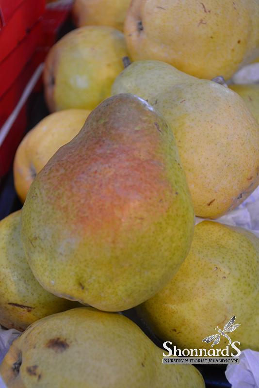 This large-growing fruit tree features very showy white flowers in spring, and tasty yellow pears with a red blush in late summer; has an upright oval habit, very ornamental; needs a pollinator, fallen fruit can be messy; susceptible to fireblight.