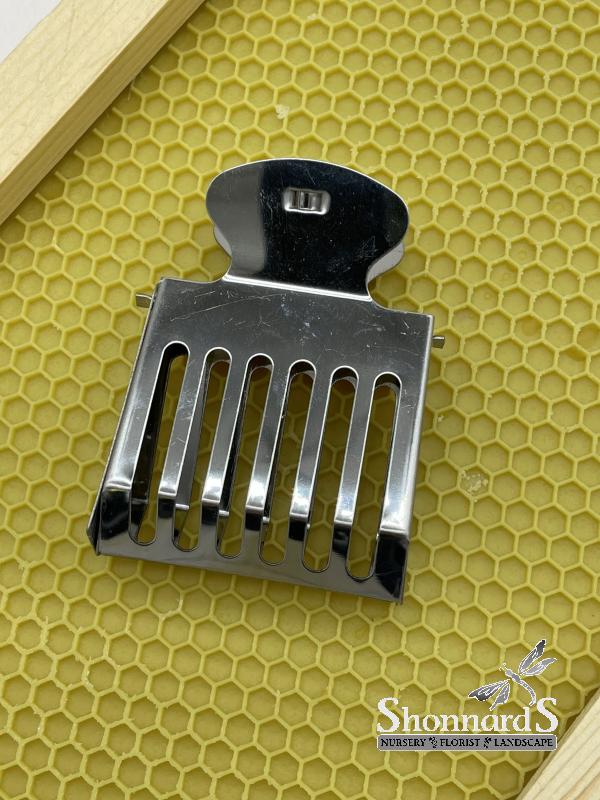 This queen catcher has large enough slits for the queen to breathe and for house bees to feed her, but small enough that a laying queen cannot slip through and escape. It is useful for a variety of tasks, including: