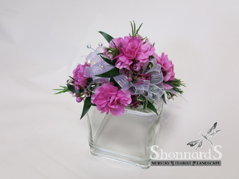 A boutonniere made with Standard Carnation - Leather Fern - Dainty Filler Flower