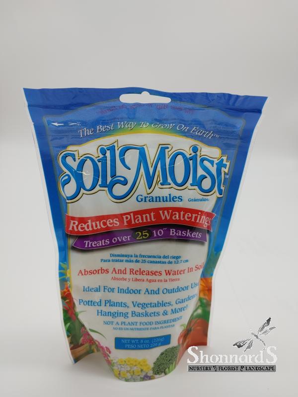 Soil Moist polymers reduce your plant waterings by 50%, reduce transplant shock and soil compaction and is effective in the soil for 3-5 years. It is an effective water management aid that is ideal for interior and exterior plantings such as for trees, shrubs, containers, baskets, flower beds, vegetables and turf. Soil Moist acts as a form of insurance for the plant and is environmentally friendly.