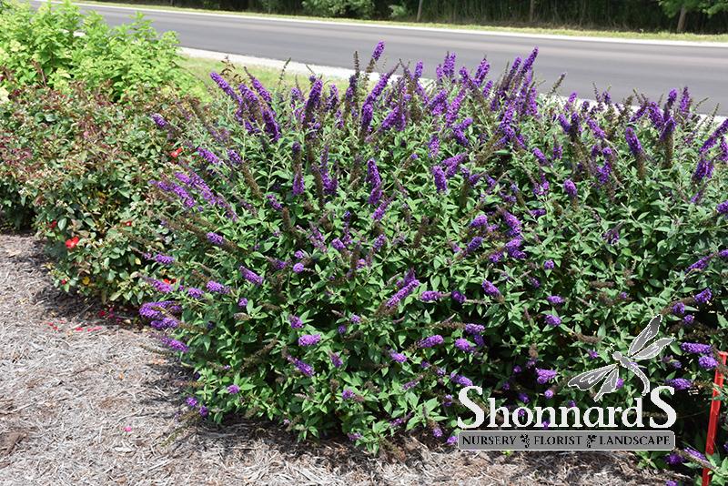 A valuable compact garden plant with spectacular dark purple-violet spikes of flowers in summer; attracts butterflies; may treat as a perennial and cut it back to the ground each spring as it regrows vigorously and blooms on new wood; seedless