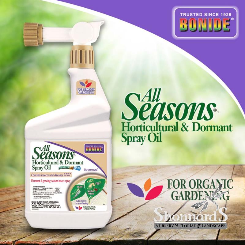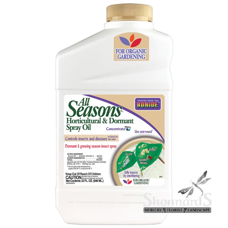 Mix the recommended amount of Bonide All Seasons Oil with water according to the label instructions. Apply the solution using a sprayer, ensuring even coverage on both the tops and undersides of leaves. For best results, apply during calm weather to minimize drift.