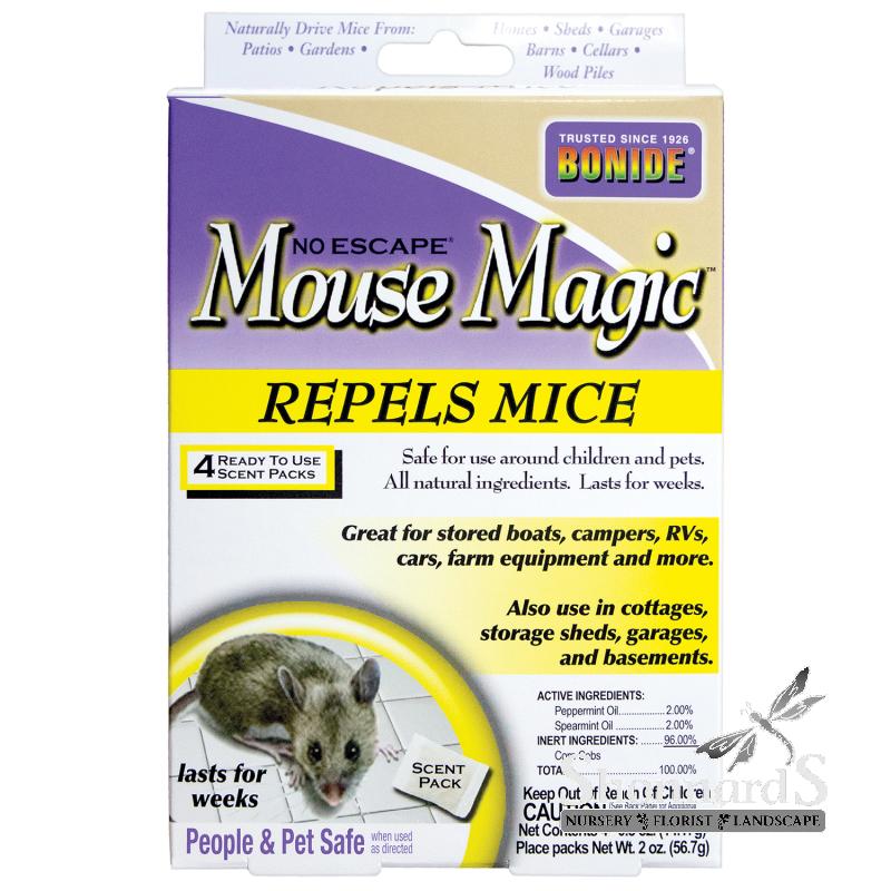 BONIDE Mouse Magic Scent Packs repel mice in the home, garage, cottage, attic or where ever mice could be a problem. Made with natural ingredients. People & pet safe, when used as directed.