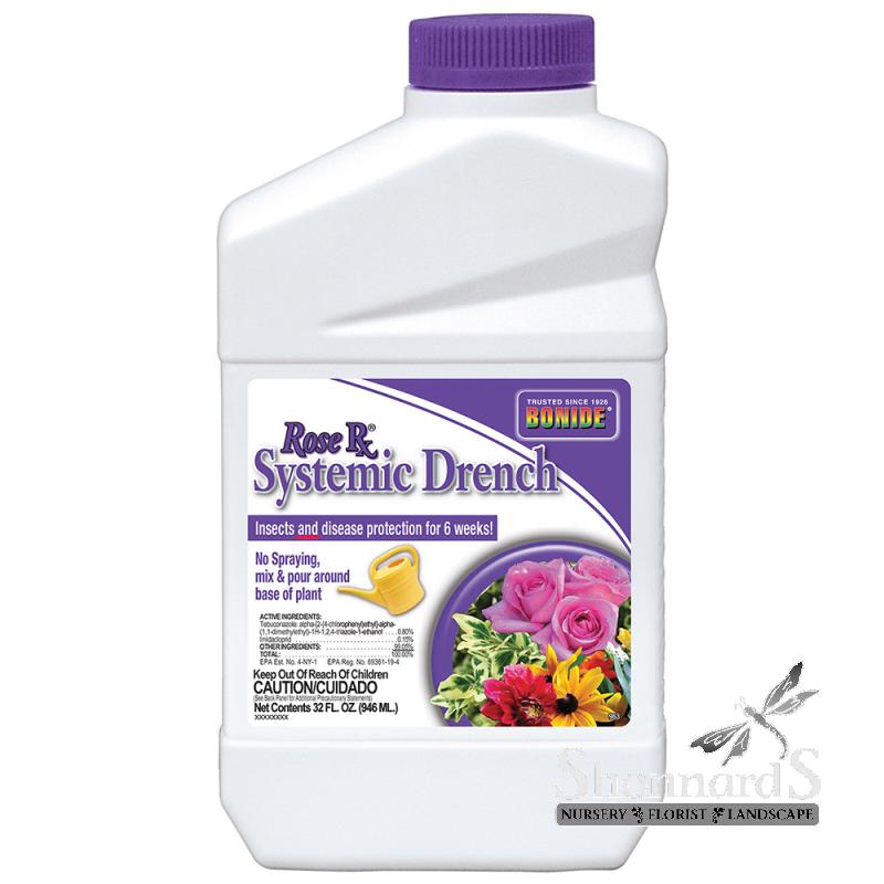 BONIDE Rose-Rx® Systemic Drench provides up to 6 weeks of both insect and disease control for your roses, listed flowers, and ornamentals. There is no messy spraying, just pour along the base of the plant. One quart treats up to 16 roses.