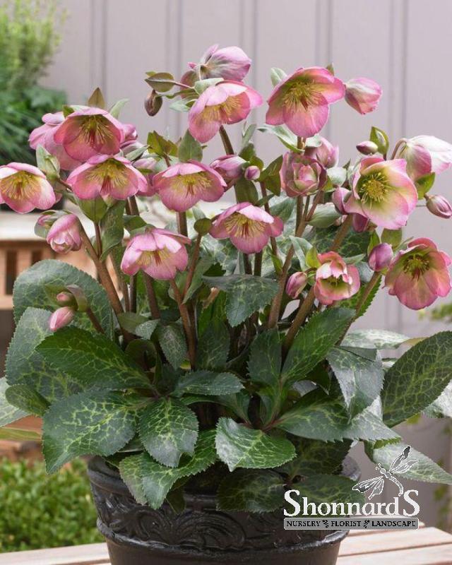 Silver-veined evergreen foliage and large pink flowers bloom from late winter to mid-spring. The upward-facing blooms are the star attraction in any late winter and early spring garden.