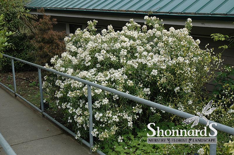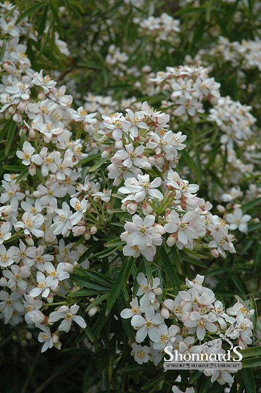 A compact, rounded evergreen shrub with dark green compound foliage; clusters of white, fragrant flowers appear in spring and sometimes again in summer; good for hedging as well