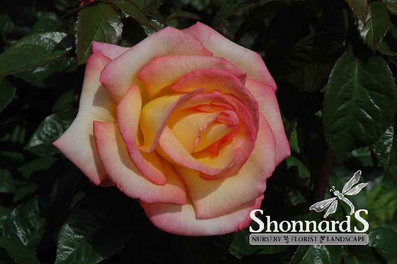 Stunning yellow double blooms with brushes of shell pink and red edges create tremendous visual impact when massed in the garden; blooms repeat all season long and make splendid cut flowers; strong fragrance.