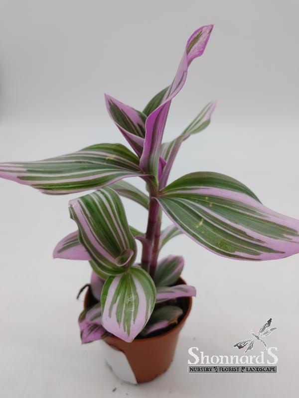 The leaves are typically adorned with a stunning mix of greens, purples, and silvers, creating a striking visual appeal. This plant has a trailing growth pattern, making it an excellent choice for hanging baskets or as a cascading addition to shelves.