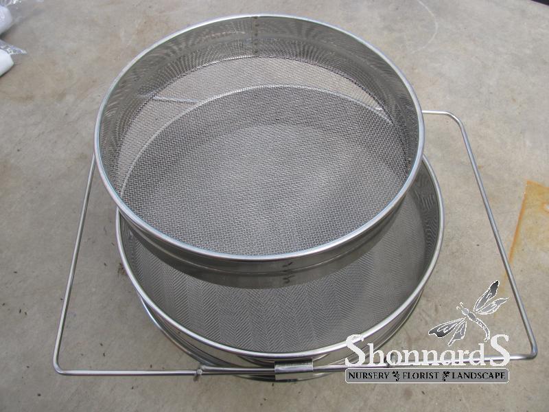 This double sieve can be seated atop your five or six gallon bucket. Honey flows from the extractor through the course mesh, and finally through a finer mesh and into the bucket. In most cases this sieve provides all the filtration needed for beautiful honey. Stainless steel.
