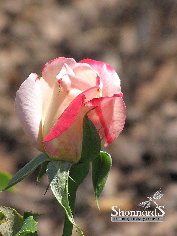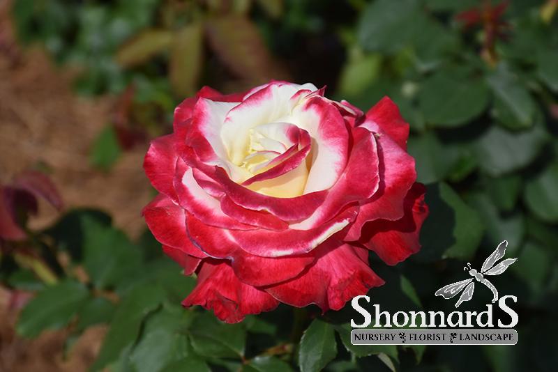 Beautiful eye catching color gets noticed on this very popular hybrid; the prolific bush provides continuous blossoms of butter and cream petals that are edged in a deep ruby red; plant is compact with beautiful deep green disease resistant foliage.