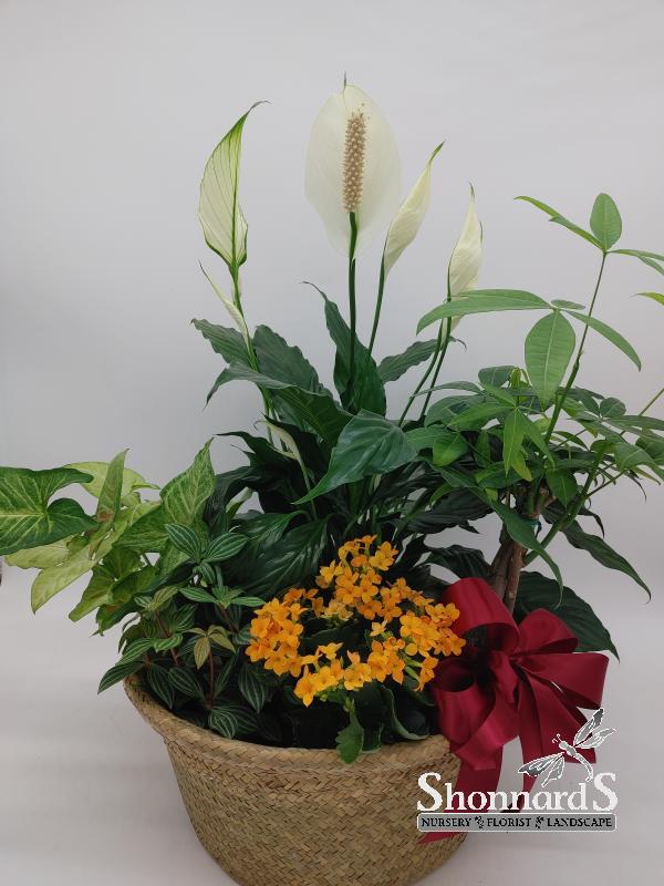 This is a mixed basket of potted flowering and foliage indoor plants. It makes a great gift for plant lovers of all kinds.
