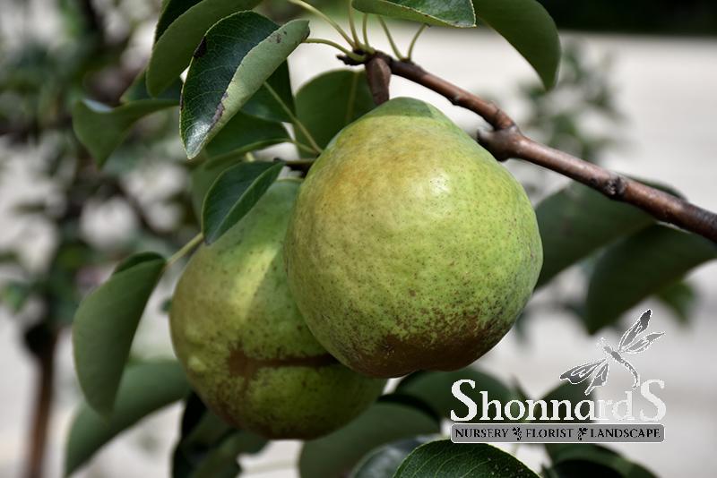 The most commercially popular pear, produces excellent quality yellow-green fruit in early fall; very showy white flowers in spring and an upright oval habit, very ornamental; needs a pollinator, fallen fruit can be messy, can be susceptible to fireblight.