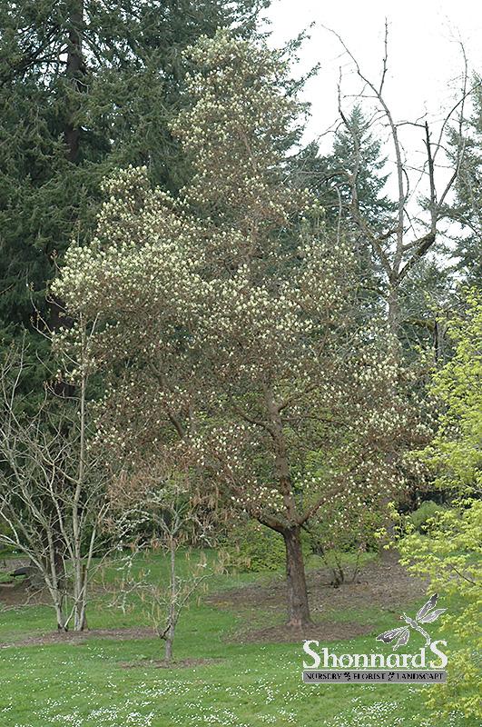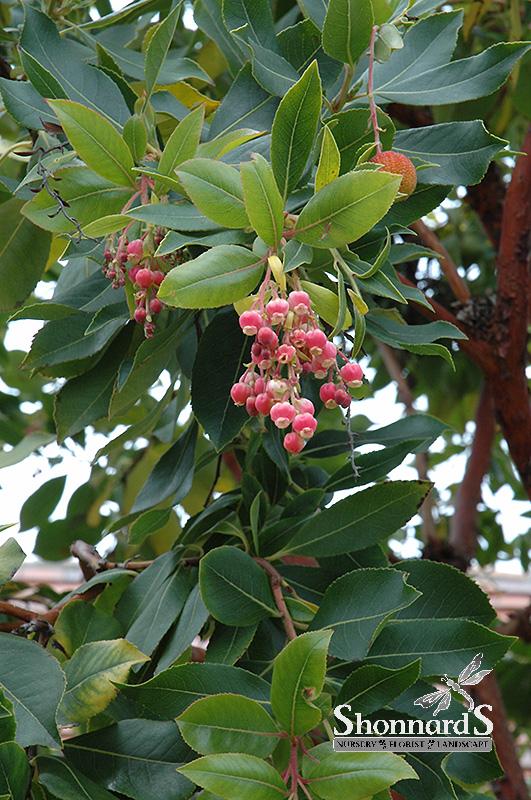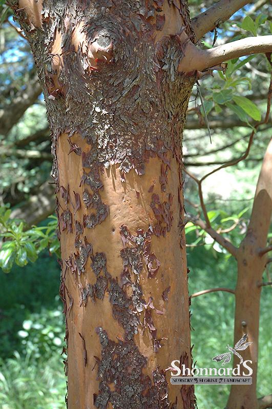 Pacific Madrone features showy clusters of white bell-shaped flowers hanging below the branches from mid fall to late winter. It has green evergreen foliage which emerges light green in spring. The pointy leaves turn brown in the fall, which persists throughout the winter. The peeling antique red bark is extremely showy and adds significant winter interest.