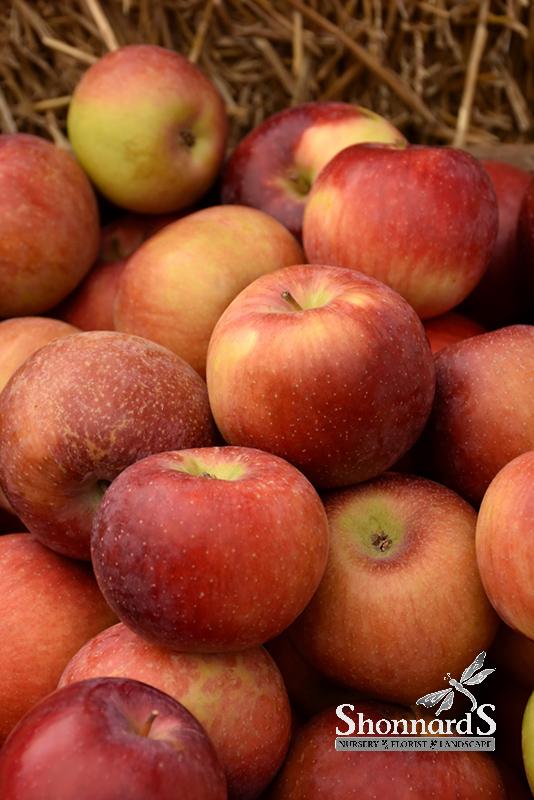 A popular red table apple with a greenish blush, excellent flavor, keeps well, late harvest; eating apples are high maintenance and need a second pollinator; the perfect combination of accent and fruit tree, needs well-drained soil and full sun.