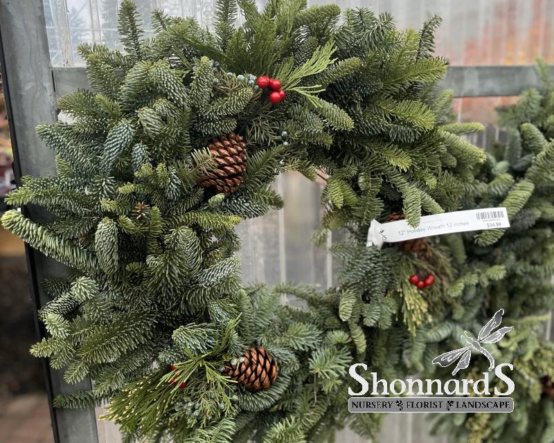 Wreath is made on a 12" ring; approx. total wreath width with greens in 24 inches.