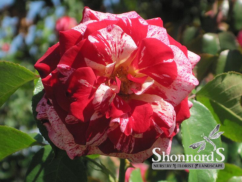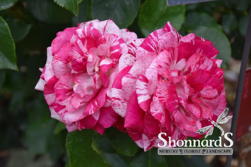Exciting scarlet flowers streaked with cream and pink will stand out in your landscaping with this wonderful hardy and vigorous grandiflora; blooms up a storm throughout the season and will make a tremendous visual impact along walkways