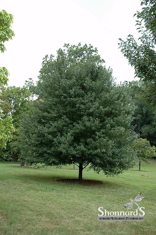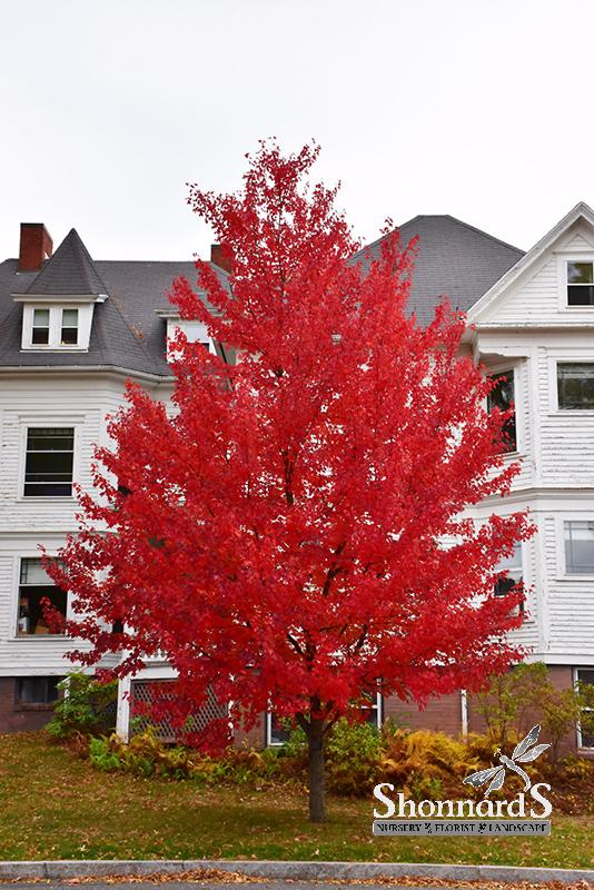A showy fall-coloring accent tree for the home landscape, featuring an upright oval habit of growth, attractive red flowers in early spring, and brilliant red foliage in fall, a male variety that does not produce seeds; intolerant of alkaline soils