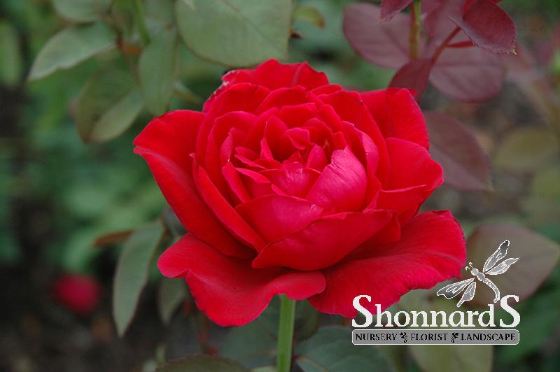 This velvety, deep red hybrid tea rose is one of the most popularly grown garden roses; beautiful as well as strongly scented; its blossoms are held on stiff upright stems; a lovely and classic addition to the garden, borders, or along walkways.