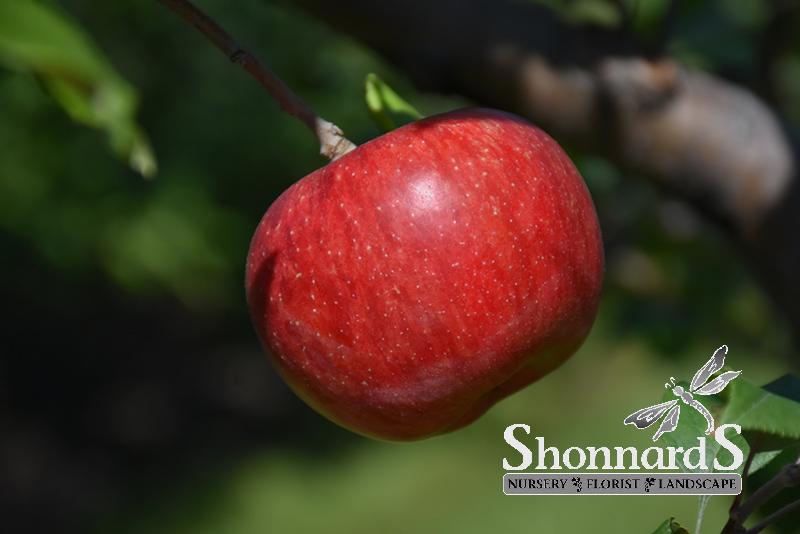 A large, pale red to green apple, with a dark red blush; has a mild flavor, and used primarily for cooking; apples are high maintenance, and need a second pollinator; ideal for home landscapes, needs well-drained soil and full sun.