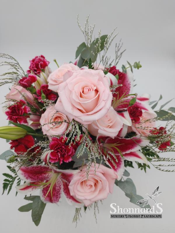 Typically includes: Roses, Stargazer or Starfighter Lillies, Stock, and filler flowers with an accent of greenery.