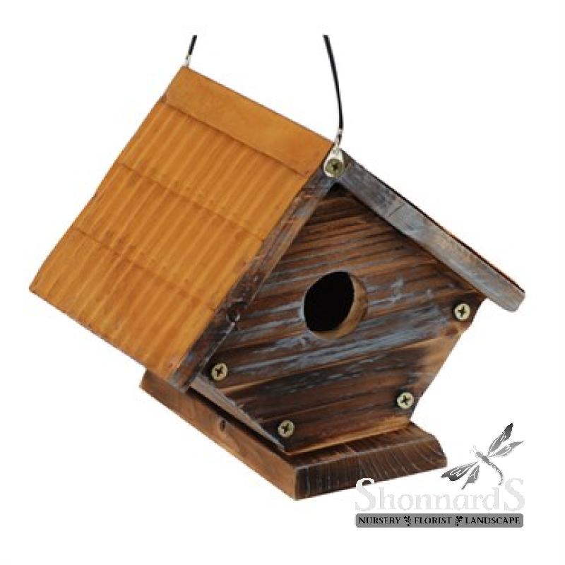 Rustic wren bird house with metal roof is rustic looking and comes ready to hang on any branch or garden hook.