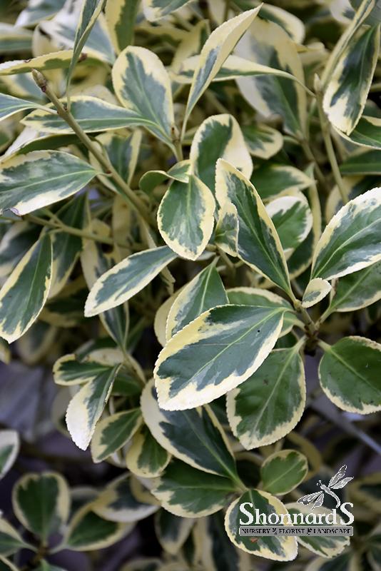 Rich glossy dark-green foliage features bright creamy-white variegation and toothed edges; seaside salt tolerance; a great hedge plant with light dense branches that tolerate shearing for a formal appearance, or leave to its natural shape.
