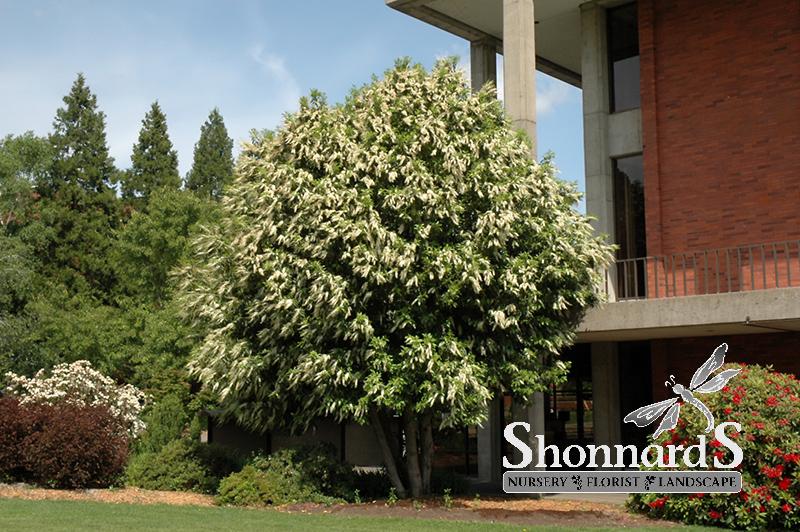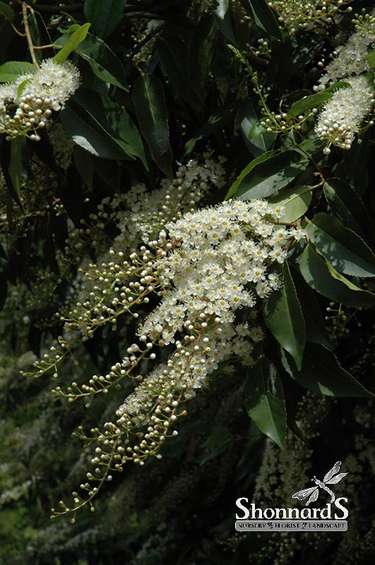 A large growing dense laurel, producing showy, fragrant, erect white spike flowers, black fruit and glossy dark-green leaves; this vigorously growing variety makes a stunning hedge or accent plant, takes pruning very well
