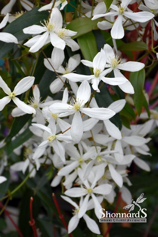 Snowdrift Clematis is blanketed in stunning lightly-scented white star-shaped flowers with buttery yellow anthers at the ends of the branches from early to mid spring. It has green evergreen foliage. The compound leaves remain green throughout the winter.