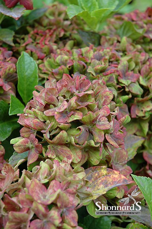 Pistachio Hydrangea features showy clusters of pink flowers with lavender overtones and light green edges at the ends of the branches from early to late summer. The flowers are excellent for cutting. It has forest green deciduous foliage. The glossy pointy leaves turn an outstanding burgundy in the fall.