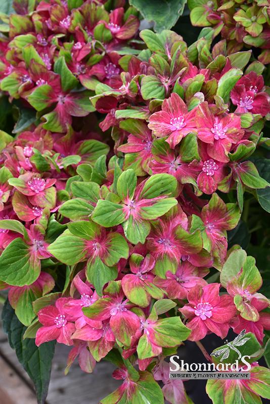 Magnificent blooms of pink or lavender, with bright green petal tips and edges; a compact plant that is awash in color all summer; pink or blue tone depends on soil type; a sensational ornamental shrub for the garden or border.