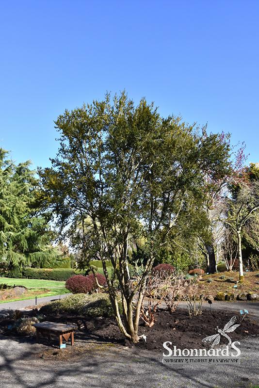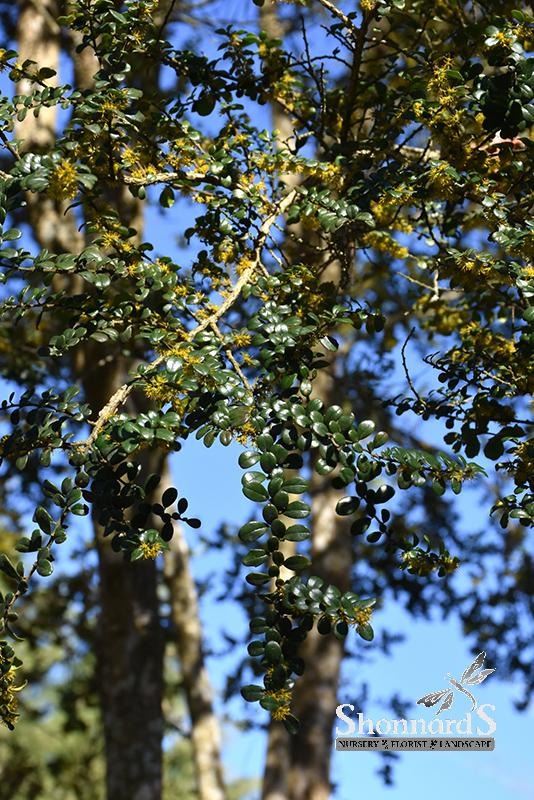 A graceful, layered, large evergreen shrub or small tree with tiny, glossy green foliage; clusters of yellow flowers along the branches have a delicious vanilla fragrance; tremendous as an accent, under taller trees, or as a hedge or screen