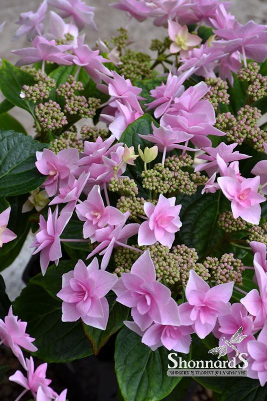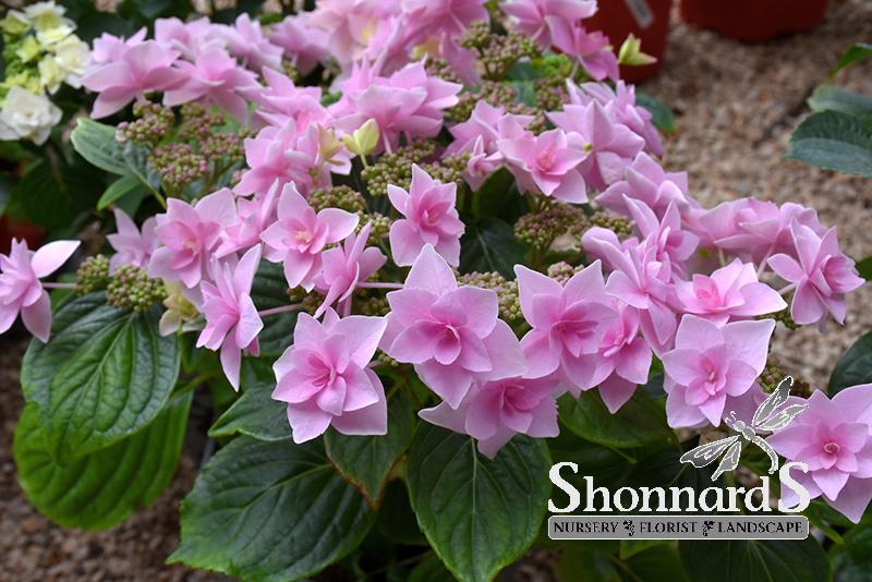 A truly delightful shrub which features stunning rose-pink double flowers with white petal edges, in dense clusters atop firm stems; color depends on soil type; a wonderful addition to the garden or border.
