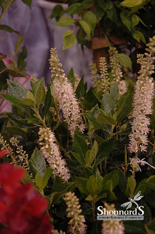 Produces bountiful spikes of intensely fragrant white flowers in late Summer when little else blooms, good yellow Fall color as well; needs moist acidic soil; some suckering, good for filling in an area