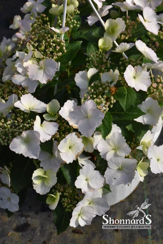 Fairytrail Bride® Cascade Hydrangea® features bold semi-double white lacecap flowers with shell pink overtones at the ends of the branches from early to late summer. The flowers are excellent for cutting. It has dark green deciduous foliage. The serrated pointy leaves do not develop any appreciable fall color.